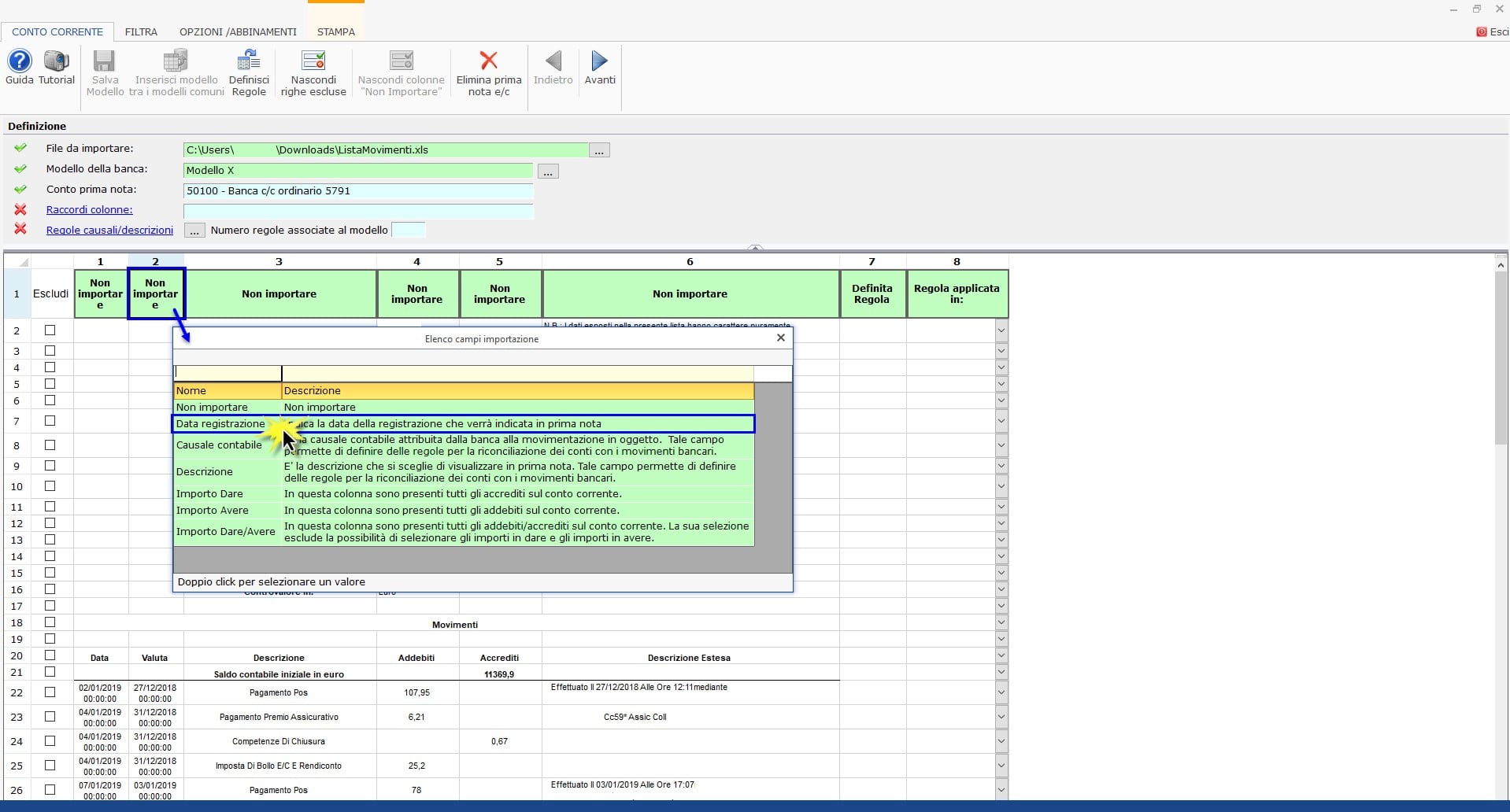 Il “modello banca” consente di definire il contenuto delle colonne presente nel file importato.