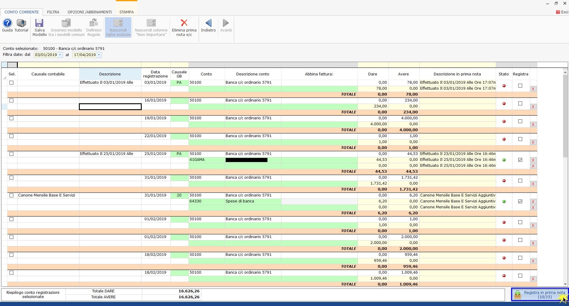 Una volta create/applicate le regole ritenute opportune clicchiamo il pulsante “Avanti” per passare alla predisposizione delle prime note contabili di incasso/pagamento.