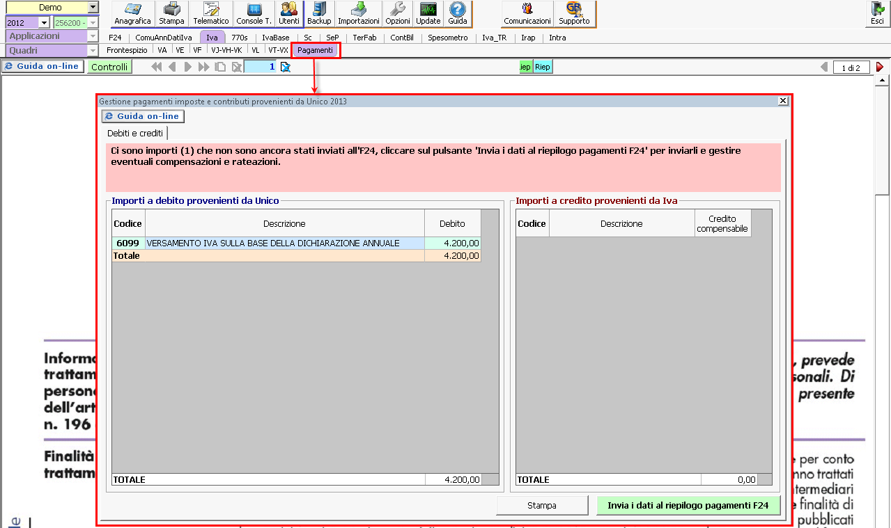 All’interno della gestione la procedura evidenzia i debiti e i crediti che sorgono dalla dichiarazione e che possono essere inviati alla gestione “Riepilogo pagamenti dichiarazioni” dell’Applicazione F24, nella quale possono poi essere effettuate le compensazioni, le rateazioni e i pagamenti dei tributi.