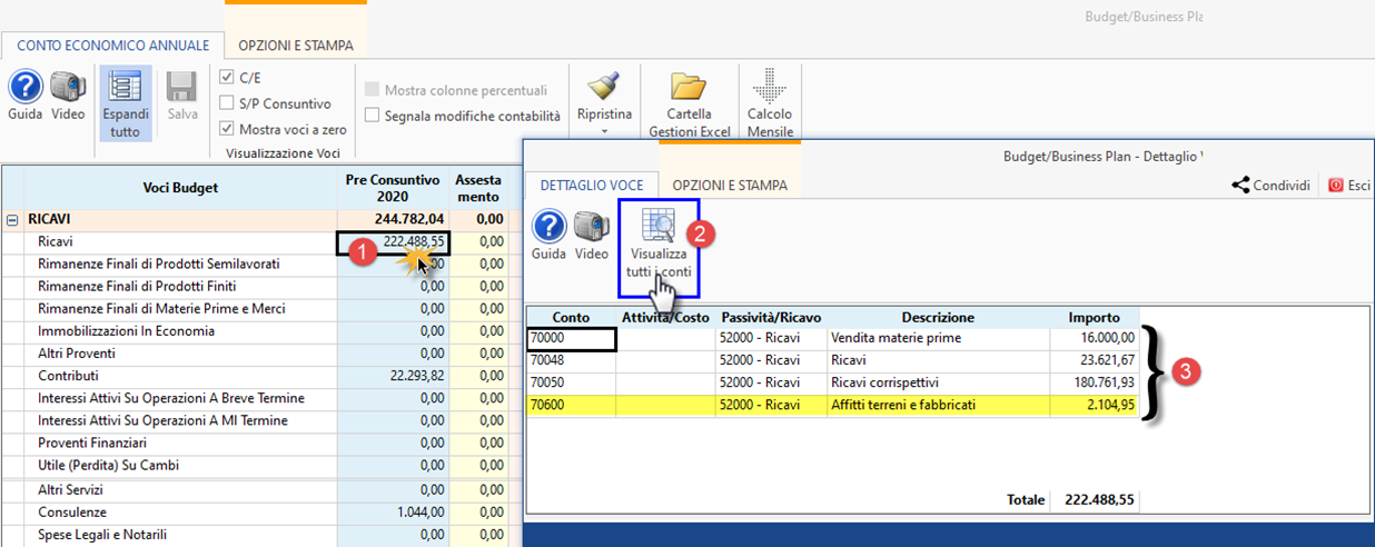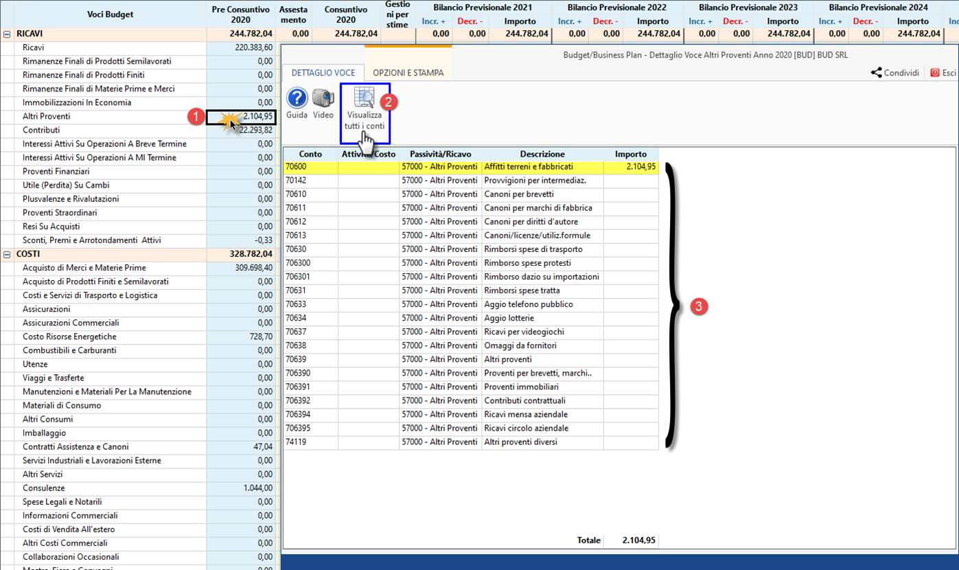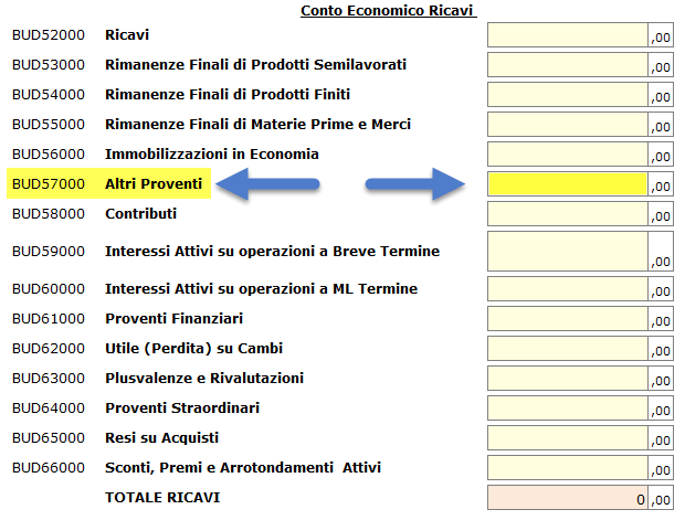 Dopo aver eseguito l’importazione del consuntivo anno precedente, ipotizziamo di analizzare i raccordi al mattone Altri proventi dell’economico:
