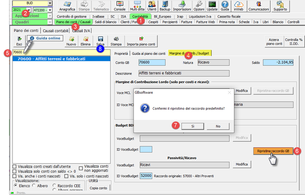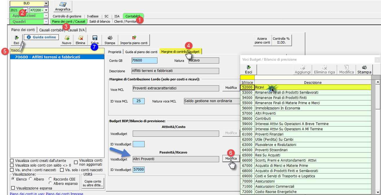 Sarà necessario uscire dal Budget, ed entrare nel piano dei conti 2021 della ditta, cercare il conto 70600, selezionare la TAB Margine di contrib./budget, quindi cliccare il pulsante modifica e salvare: