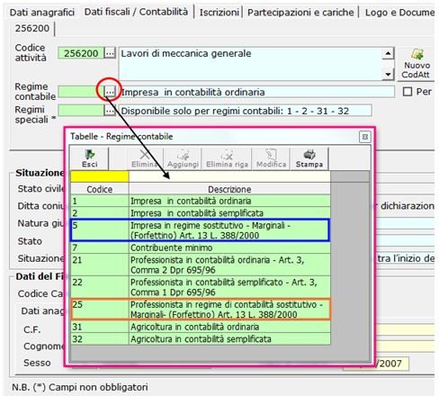 Sono disponibili : regime 5Impresa in regime sostitutivo – Marginali – (Forfettino) Art. 13 L. 388/2000 e regime 25Professionista in regime di contabilità sostitutivo – Marginali- (Forfettino) Art. 13 L. 388/2000.