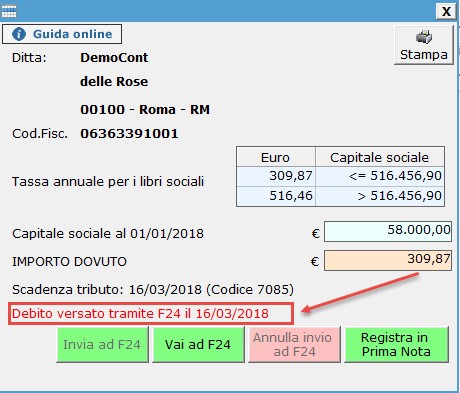 Una volta prenotato il modello “F24”, nella maschera “Tassa annuale per i libri sociali” sarà riportata la data di pagamento.