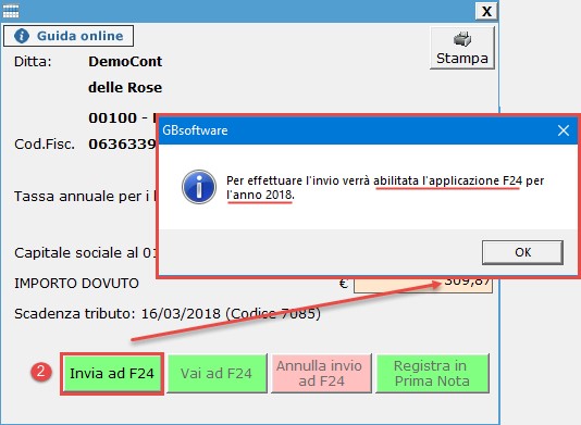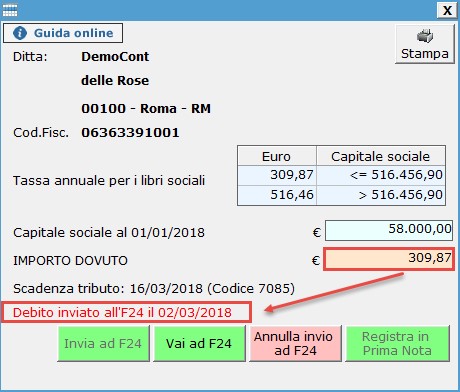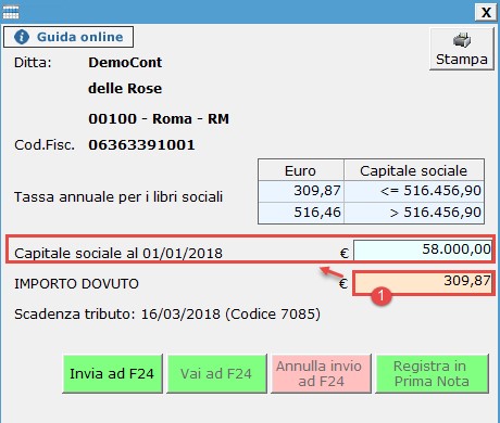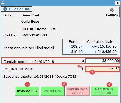 Il calcolo della “Tassa annuale per i Libri sociali 2018” è eseguito in automatico dal software in base all’ammontare del capitale sociale o del fondo di dotazione della società risultante al 1° Gennaio dell’anno per il quale si esegue il versamento: