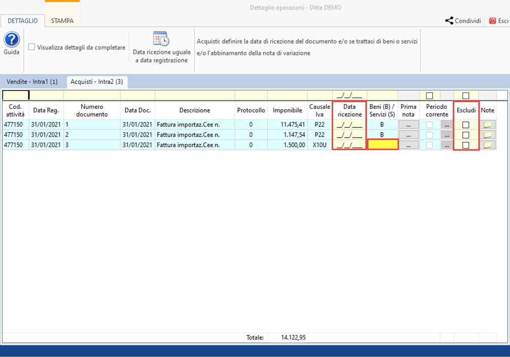 Il dettaglio delle operazioni, nella verifica Intrastat, riporta tutte le registrazioni di vendita e di acquisto effettuate in prima nota per il periodo in oggetto che devono essere eventualmente completate con l’appartenenza a beni a servizi oppure con la data ricezione.