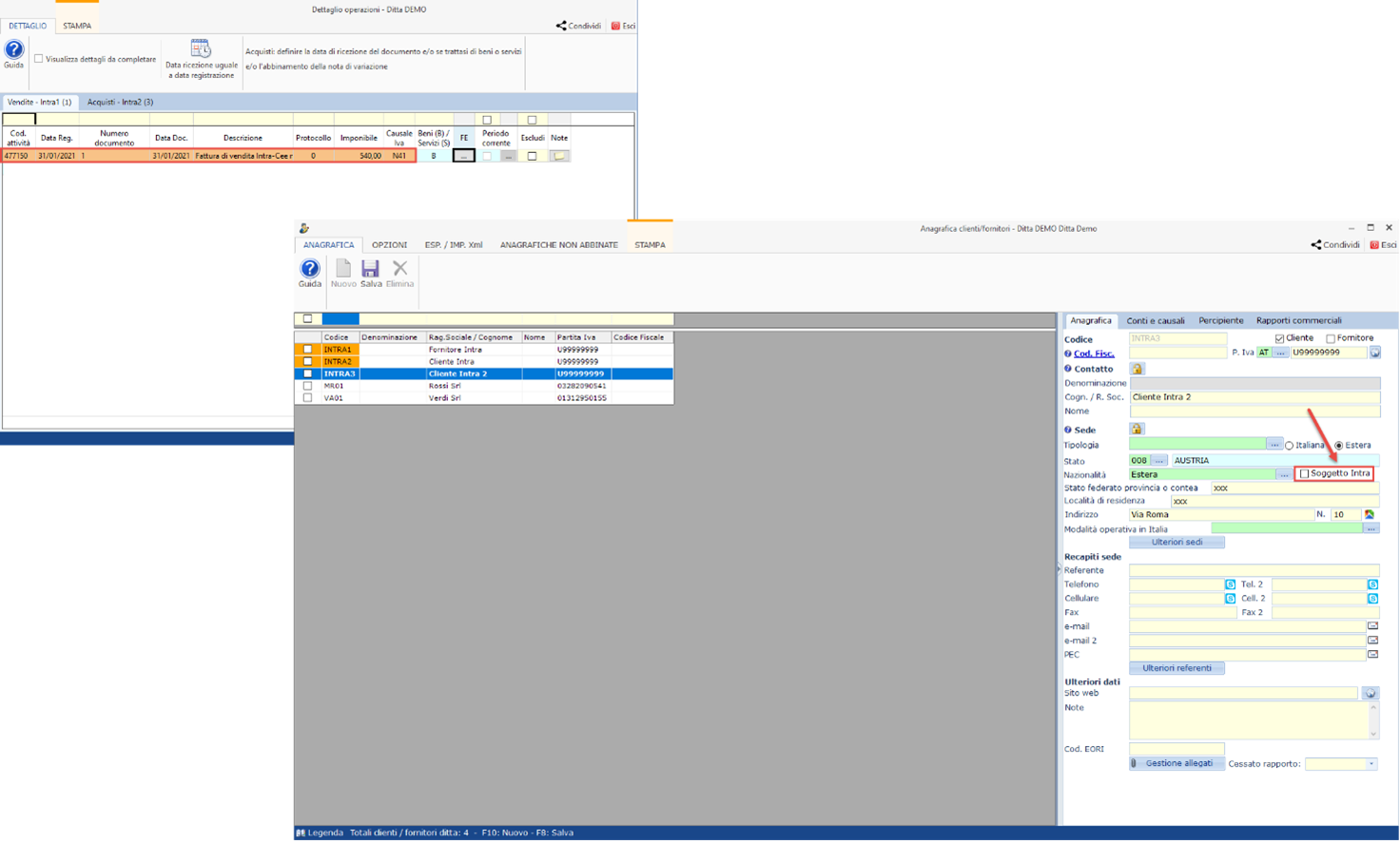 Nel primo caso il cliente o il fornitore, al momento della registrazione in prima nota, non risultava identificato come soggetto Intra dall’anagrafica Clienti/fornitori: