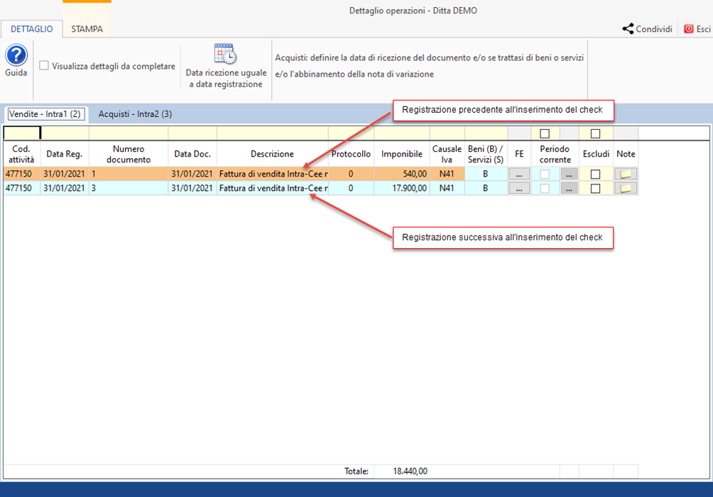 Sto verificando la periodicità di una ditta ai fini dell’invio della comunicazione Intra ma dal dettaglio delle operazioni sono presenti delle registrazioni evidenziate in arancione: cosa significa e cosa comporta per il calcolo?