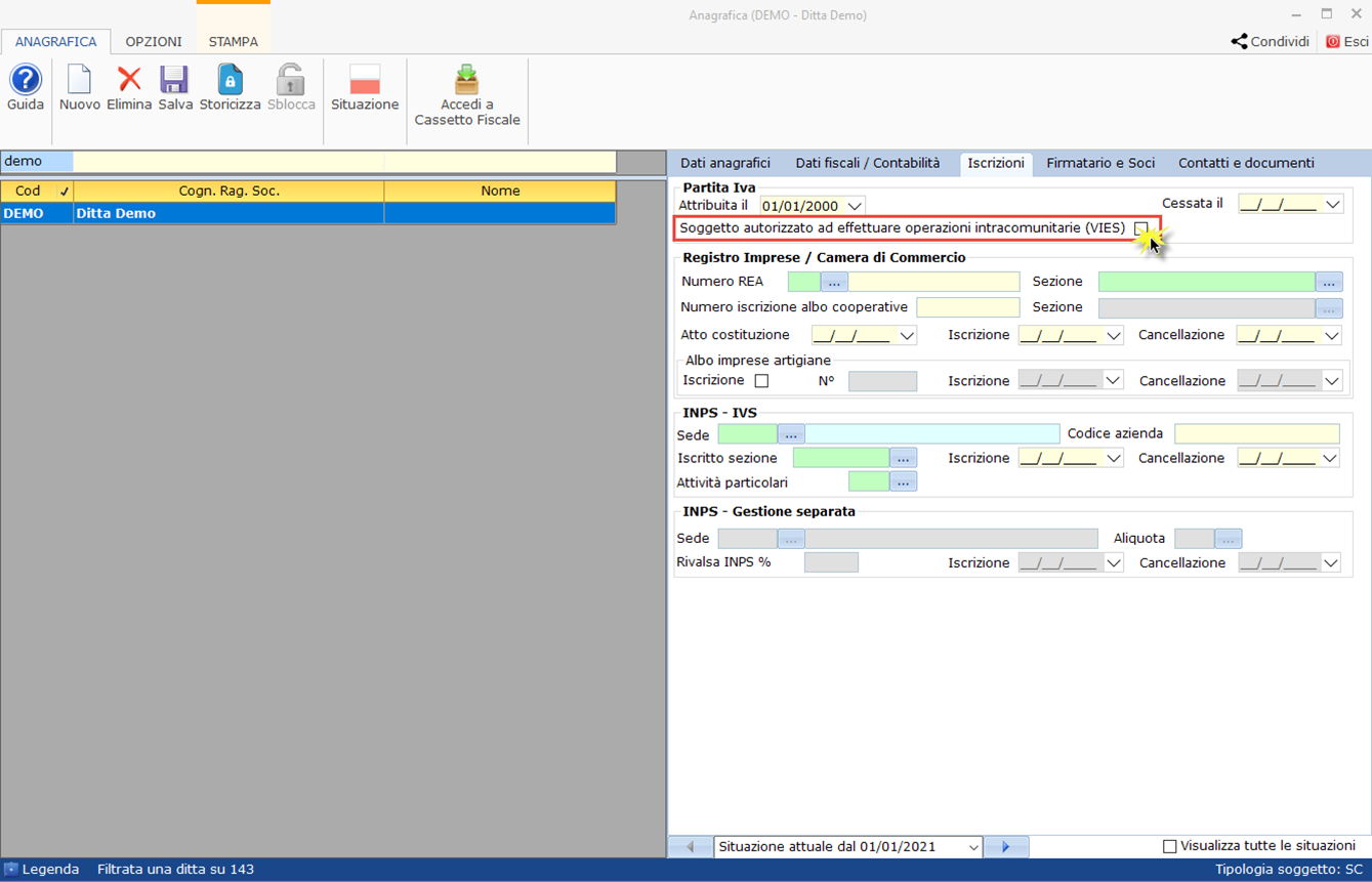- Mancanza di check in “Soggetto autorizzato ad effettuare operazioni intracomunitarie (VIES)” nella sezione “Iscrizioni” dell’anagrafica
